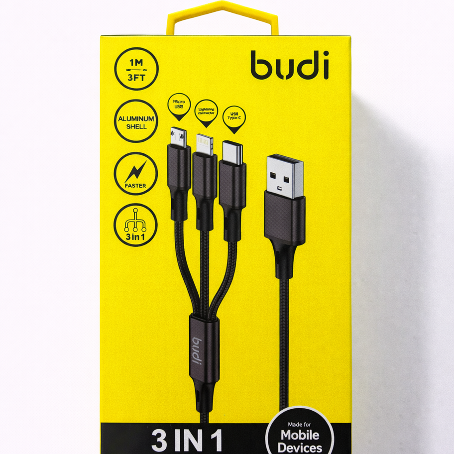Budi 3-in-1 Fast Charging Cable – Micro USB, Lightning, Type-C, 1M